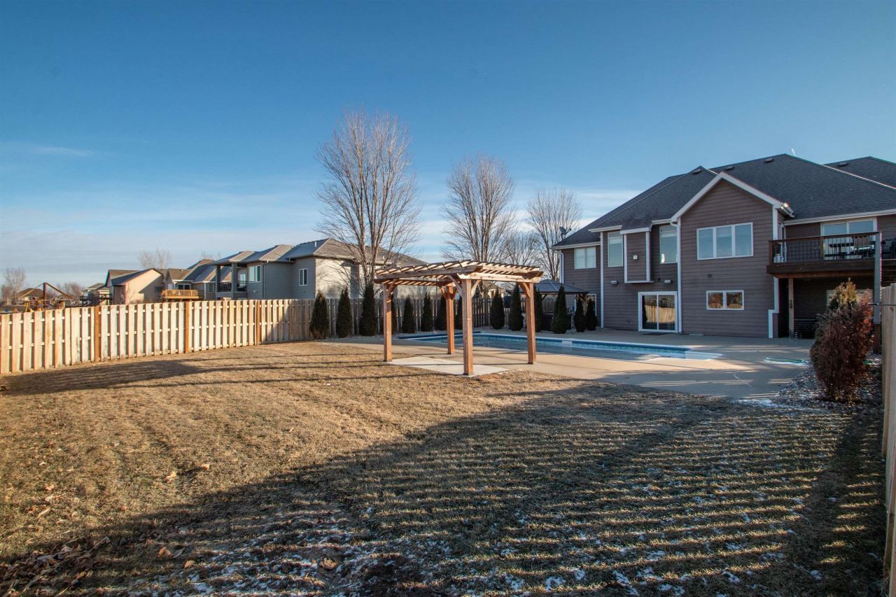 In just a few months: Buyers will be wanting a house with an inground pool!!. So lets get ahead of that search and view this 5 bedroom, 3 bath Ranch Walkout home with recent updates: New shingles 2017. New maple flooring in Living Room, Kitchen, Dining and hall way in 2019. Kitchen also has new granite counter tops, and the hickory cabinets have been stained with cherry finish. Living room features 10` ceiling, electric and stacked stone gas fireplaces; maple flooring really lightens up the room. Kitchen with new maple flooring, new frig 2022, Bosch dishwasher and electric stove. Kitchen cabinets and railing system have a cherry stain. New granite counters. Wood deck restained 2023 (14 x 14) is off the dining area. Look for those great sunsets. Primary suite also has slider to the deck, and vaulted ceiling, walk in closet. Primary bath had been updated with newer tile floor, dbl vanity, whirlpool tub and tile shower. Two other bedrooms on the main floor, which are carpeted and a full bath. Main floor laundry off the garage with extra cabinetry. Lower Level Walkout has generous open family room with 7x10 wet bar area with new granite counter tops, and ice maker added. 3rd fireplace down. Projector and screen will stay. Bedrooms 4 and 5 are carpeted and have egress windows. A workout room has been finished also. (8 x 12) Heated 3 car garage with side door to the side yard. Lets get outside: 16 x 32 inground heated salt water pool, with lots of concrete for seating areas, a covered hot tub with mounted TV, pergola and pool area is fenced. Beyond the cedar fencing is still lots of yard for outdoor games. Entire lot is sprinkled. Curbing around the perimeter of the house. Radon mitigation system installed..